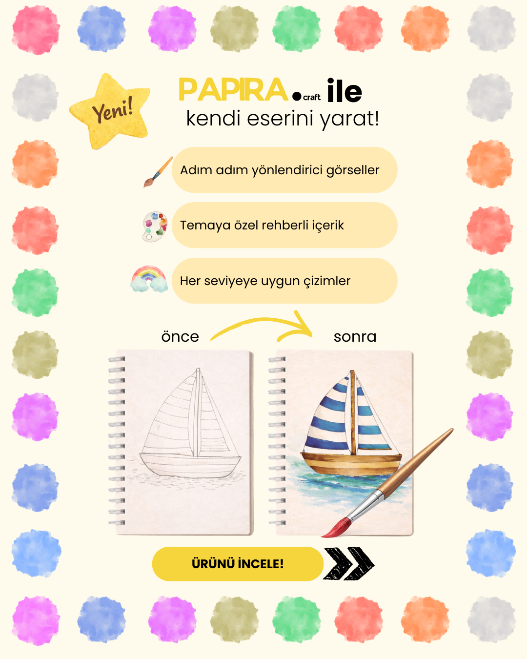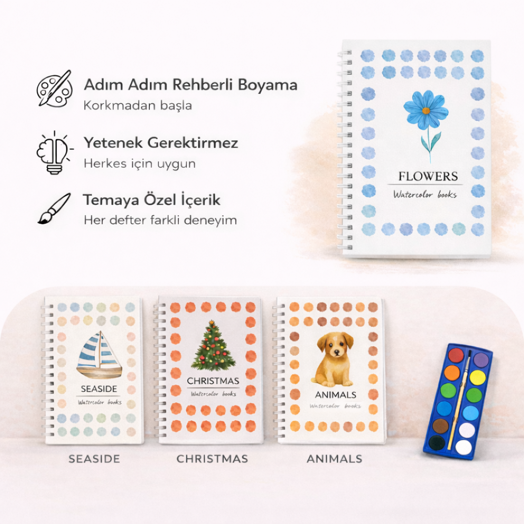 Kitabınızı kutudan çıkarın. Canlı 12 renkli bir palet ve dayanıklı bir fırçanızı alın. Karmaşık bir kurulum veya ekstra malzeme gerekmez. Çalışma kitabınızı açın ve saniyeler içinde stressiz yaratıcılığa dalmaya hazır olun. Kutudan çıkar çıkmaz anında sanat eserleri yaratmanız için tasarlandı.